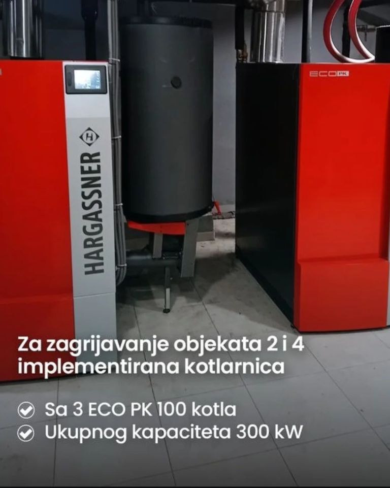 Za zagrijavanje objekata 1 i 3, kao i administrativne zgrade implementirana je kotlarnica sa 4 ECO PK 100 kotla, ukupnog kapaciteta 400kW, koji obezbjeđuju optimalnu distribuciju toplote, uz smanjenje potrošnje energije i emisija.