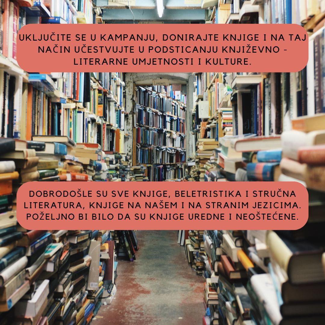 Uključite se u kampanju, donirajte knjige i na taj način učestvujte u podsticanju književno - literarne umjetnosti i kulture.